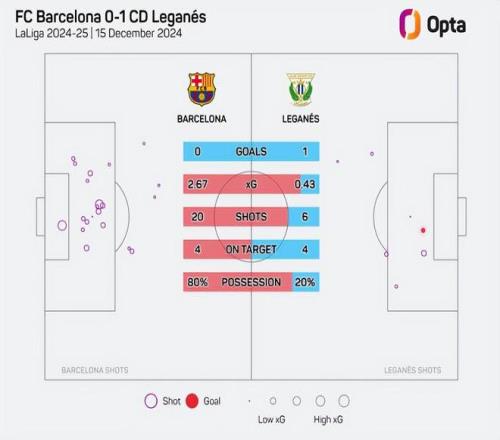 尤其以主场0比1不敌莱加内斯为例,当时巴萨预期进球高达2.67,对手预期进球仅有0.43,结果就是对方偷袭成功,让巴萨在主场饮恨。
